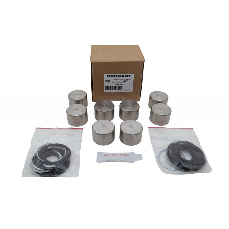 Stainless steel brake caliper piston kits. Each kit is one complete axle, either front or rear as stated. The kit includes OEM repair kit and grease sachet.